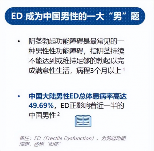數(shù)據(jù)表明,超過(guò)四成男性存在健康問(wèn)題和困擾,其中性健康問(wèn)題更是當(dāng)代男性的三大困擾之一。值得注意的是,勃 起功能障礙(Erectile Dysfunction,簡(jiǎn)稱ED)作為最常見的性 健康問(wèn)題,由于沒(méi)有得到科學(xué)規(guī)范的及時(shí)治療,正在不斷威脅廣大男性的健康,并進(jìn)一步給家庭生活和社會(huì)經(jīng)濟(jì)造成負(fù)擔(dān)。
