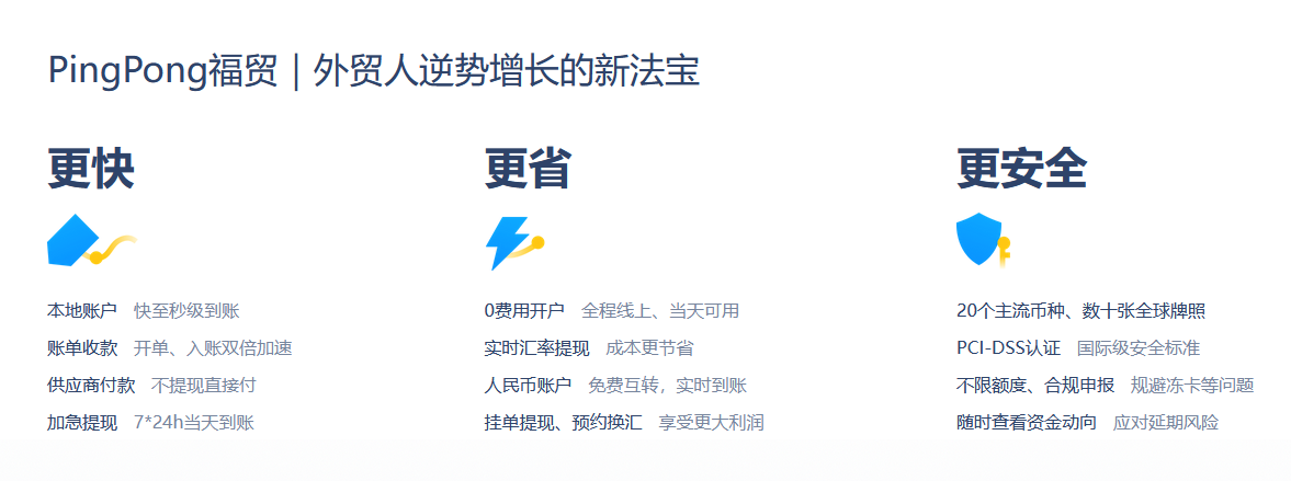 在此背景之下,進(jìn)一步挖掘外貿(mào)企業(yè)的數(shù)字化轉(zhuǎn)型高新技術(shù)賦能將成為我國外貿(mào)經(jīng)濟(jì)建設(shè)的關(guān)鍵步伐。而對此,PingPong福貿(mào)作為國內(nèi)外貿(mào)收付領(lǐng)域的數(shù)字先行者,充分發(fā)揮了自身強(qiáng)大的數(shù)字技術(shù)應(yīng)用能力和全球收付服務(wù)建設(shè)能力,打造了一站式數(shù)字化外貿(mào)收付款解決方案,致力為廣大中小外貿(mào)企業(yè)降低國際貿(mào)易成本,推動(dòng)企業(yè)通過數(shù)字賦能在全球貿(mào)易競爭中具備強(qiáng)勁實(shí)力。