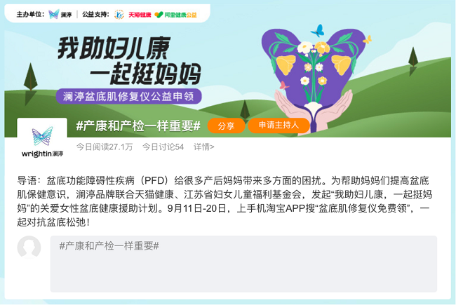 今年9月,瀾渟聯(lián)合天貓健康、阿里健康公益、江蘇省婦兒基金會(huì)四方聯(lián)合發(fā)起的線上公益活動(dòng)“我助婦兒康,一起挺媽媽”,免費(fèi)申領(lǐng)瀾渟盆底肌修復(fù)儀,總計(jì)50 臺(tái)盆底康復(fù)治療儀,兩天時(shí)間里,微博話題閱讀量超1.5億,推動(dòng)公眾對女性盆底健康問題的關(guān)注與支持。