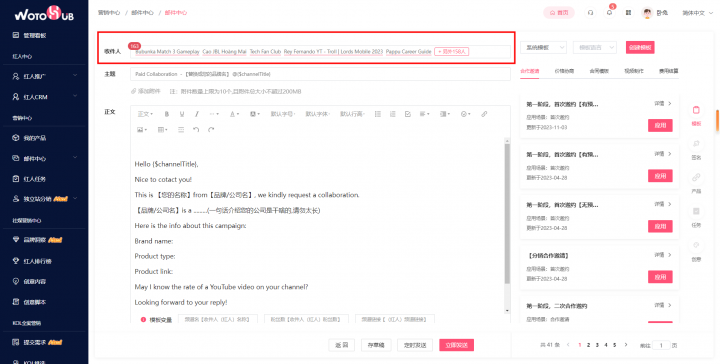 賣家在WotoHub 4.0內(nèi),還可在站內(nèi)直接與紅人溝通,還能利用系統(tǒng)的郵件輪循技術(shù),同期開發(fā)2000名達人暢通無阻,降低邀約郵件被認定為垃圾營銷的風(fēng)險。