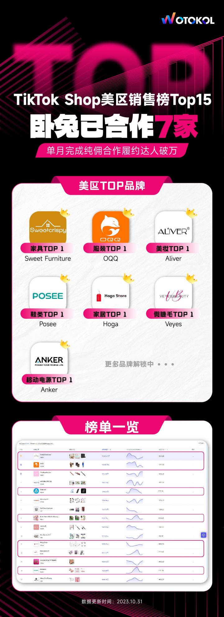 無論是在電商生態(tài)上,還是賣家本土化運營的能力上,TikTok美區(qū)小店彰顯出來的活力都不容小覷。榮幸地是,在上述TikTok美區(qū)小店銷售額Top15排行榜內(nèi),有近五成以上的商家均與WotoKOL臥兔網(wǎng)絡(luò)達成深度合作。且在與TikTok美區(qū)達人合作方面,WotoKOL臥兔網(wǎng)絡(luò)單月完成純傭合作履約達人破萬。