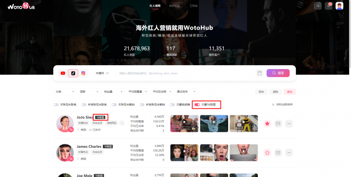 1.庫容量大:WotoHub通過全量上線全球TikTok帶貨紅人資源,目前系統(tǒng)擁有超2000萬活躍紅人資源。