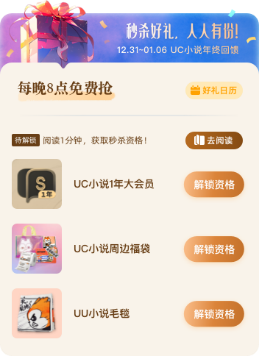 在“秒殺好禮,人人有份”的0元限時秒殺活動中,用戶只需上UC搜索“UC小說新年禮”關(guān)鍵詞,點擊活動頁面,閱讀小說時長滿1分鐘,即可解鎖免費秒殺活動禮品的資格(獎品明細詳見UC活動內(nèi)的禮品日歷)。