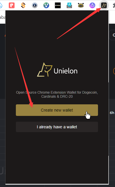 這時(shí)會(huì)彈出提示,要求你先安裝 Unielon Wallet 錢包,點(diǎn)擊 Install 進(jìn)入谷歌應(yīng)用商店,點(diǎn)擊“添加至 Chrome”,安裝谷歌插件。安裝完畢,點(diǎn)擊瀏覽器上的Unielon Wallet 錢包圖標(biāo),看下圖,是大家熟悉的谷歌插件錢包的初始界面,和常見的MetaMask小狐貍錢包大同小異,點(diǎn)擊Create new wallet 創(chuàng)建新錢包
