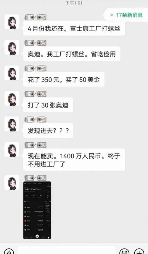 上半年 ORDI 銘文鑄造之初,少有人關(guān)注,以至于微信群中幾十塊轉(zhuǎn)讓都無(wú)人問津。而一位在工廠的朋友,在群里看大家說(shuō)的熱鬧,就花 350 元跟人學(xué)著打了 30 張 ORDI( 3 萬(wàn)枚 ORDI)玩玩,打完就丟到腦后,繼續(xù)回廠擰螺絲,直到看到人們都在歡呼ORDI上幣安暴漲啦才想起來(lái)一看,額的神啊,當(dāng)初的350已經(jīng)變成了 1400 萬(wàn)元!他禁不住慨嘆,終于再也不用進(jìn)廠打螺絲了。