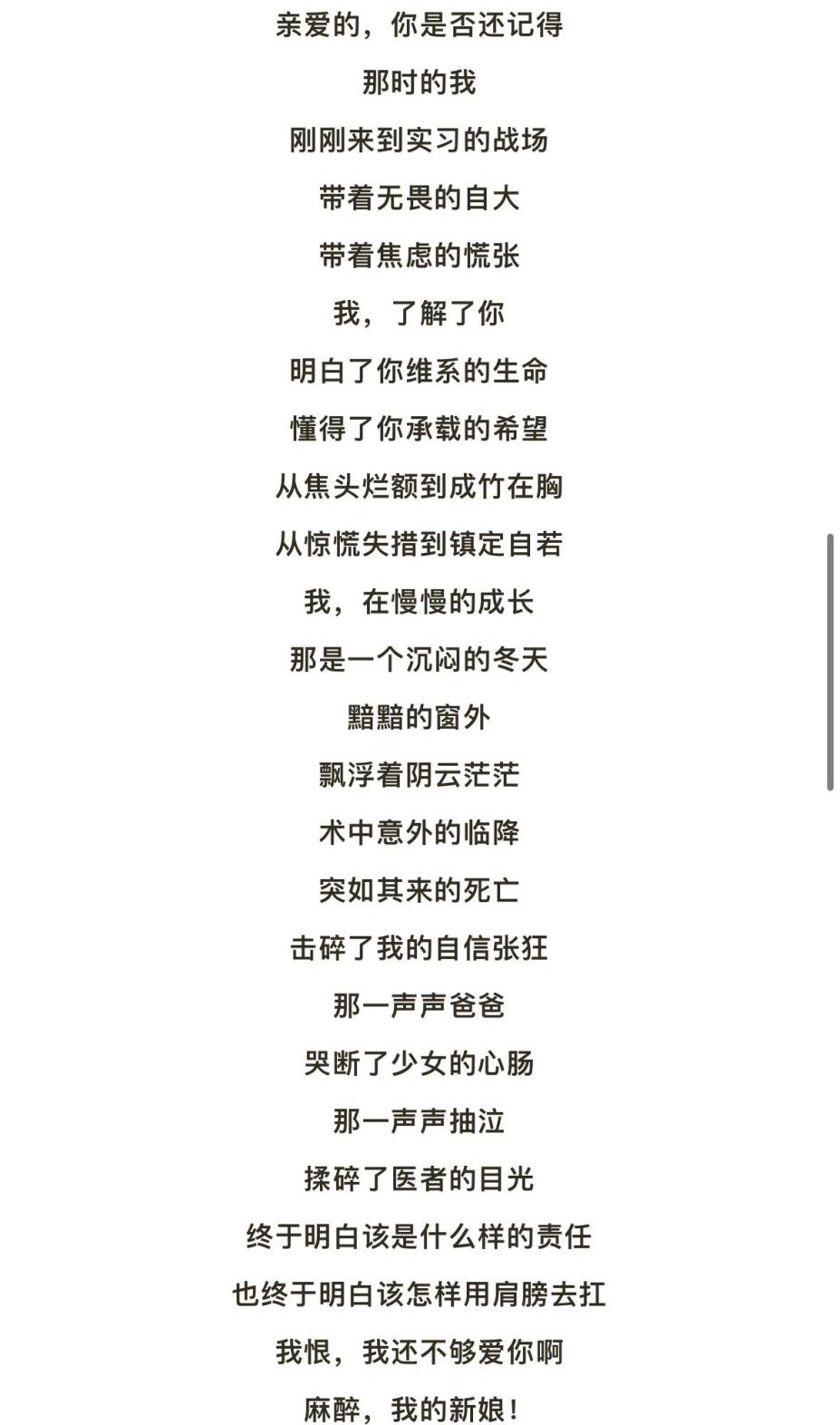 在郭晨主任的世界里,醫(yī)學(xué)不僅是科學(xué),也是藝術(shù),正如他鐘愛的詩(shī)歌一般。在手術(shù)室的嚴(yán)謹(jǐn)和緊張之余,郭主任常在詩(shī)中尋找慰藉和靈感。他熱愛寫詩(shī),用文字描繪麻醉工作中的微妙情感和深刻體悟。他的詩(shī)句中,充滿了對(duì)生命的贊美和對(duì)工作的熱愛,詩(shī)意般的語(yǔ)言,不僅表達(dá)了他對(duì)麻醉學(xué)科的深厚情感,也展現(xiàn)了他作為醫(yī)生的人文關(guān)懷和藝術(shù)氣質(zhì)。