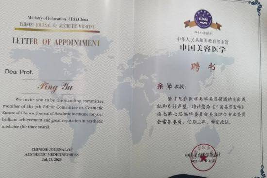 ☆圖為余萍院長被聘請為中國整形美容協(xié)會等部分分會常委及《中國美容醫(yī)學(xué)》雜志美容縫合專業(yè)委員會常委等