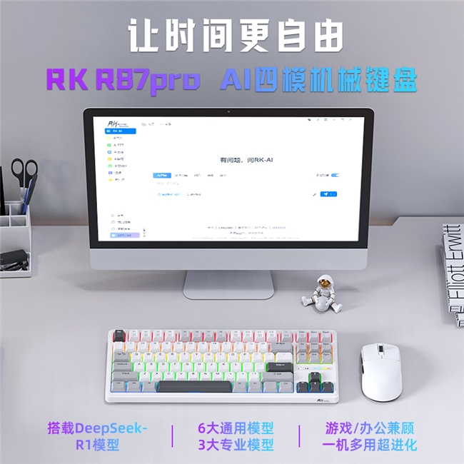 2025年4月6日,RK正式發(fā)布首款A(yù)I四模機械鍵盤。作為行業(yè)革新產(chǎn)品,R87PRO AI四模機械鍵盤以Deepseek-R1智能模型為核心,構(gòu)建起辦公智能生態(tài)全場景,突破傳統(tǒng)機械鍵盤局限,打破辦公與電競之間的壁壘,實現(xiàn)一機多用。