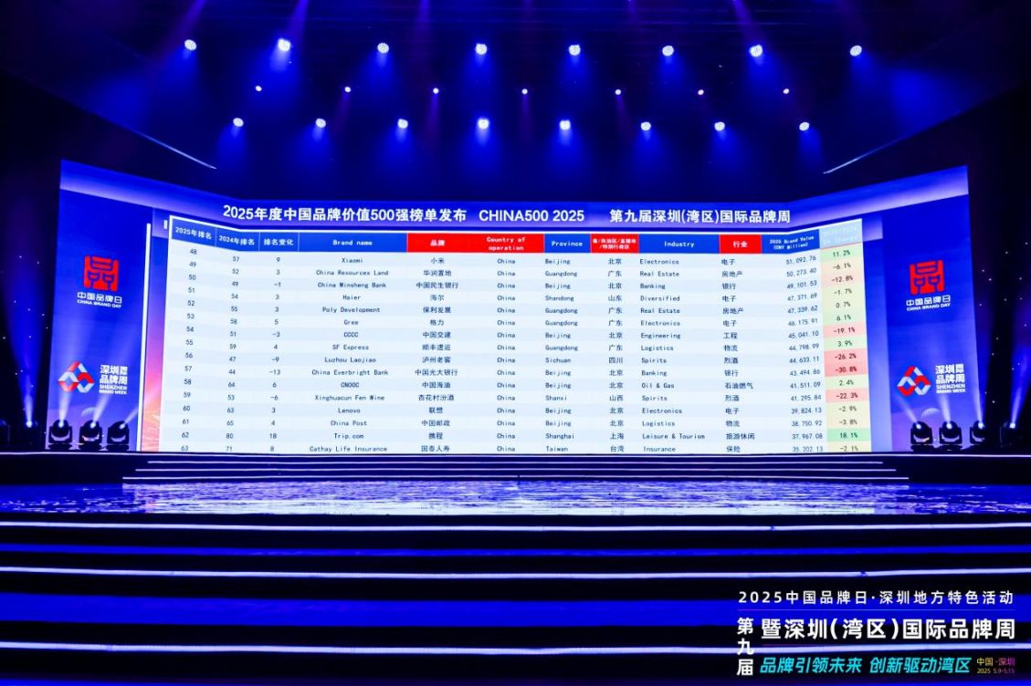 5月9日下午舉行的第九屆“深圳(灣區(qū))國際品牌周”主場活動——2025粵港澳大灣區(qū)質(zhì)量品牌峰會上,每年在達沃斯世界經(jīng)濟論壇年會上發(fā)布全球品牌價值500強的國際著名品牌價值評估咨詢機構(gòu)Brand Finance,聯(lián)合深圳工業(yè)總會獨家發(fā)布了“2025中國品牌價值500強”中英文榜單。