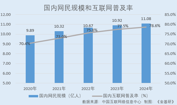 隨著移動互聯(lián)網(wǎng)時代的到來,國內(nèi)網(wǎng)民規(guī)模持續(xù)增長。據(jù)中國互聯(lián)網(wǎng)絡(luò)信息中心數(shù)據(jù),2020-2024年,國內(nèi)網(wǎng)民數(shù)量分別為9.89億人、10.32億人、10.67億人、10.92億人、11.08億人,國內(nèi)互聯(lián)網(wǎng)普及率分別為70.4%、73.0%、75.6%、77.5%、78.6%。