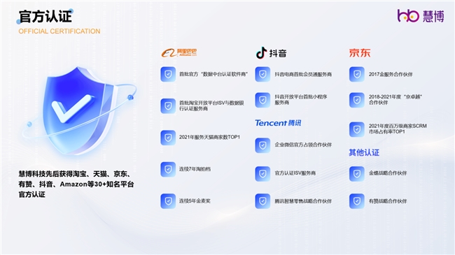 能從眾多參賽企業(yè)中 “直通” 復(fù)賽,并一路闖進(jìn)決賽,慧博科技的 “底氣” 源于 12 年深耕數(shù)智運營領(lǐng)域的沉淀。自 2013 年成立以來,公司始終聚焦技術(shù)創(chuàng)新,現(xiàn)已構(gòu)建起覆蓋“工具 + 咨詢 + 運營” 的全鏈條數(shù)智化服務(wù)體系,成為淘寶、京東、抖音等 30 + 主流平臺官方認(rèn)證的 ISV 服務(wù)商。