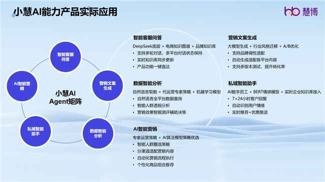 路演中,慧博團(tuán)隊重點展示了小慧 AI 的五大核心能力:智能客服問答(基于大模型 + 電商知識圖譜,應(yīng)答準(zhǔn)確率超 90%,支持多平臺對話狀態(tài)同步)、營銷文案生成(適配品牌調(diào)性,多版本 A/B 測試優(yōu)化,效率提升 10 倍)、數(shù)據(jù)智能分析(自然語言取數(shù) + 實時預(yù)警,助力商家秒級掌握經(jīng)營動態(tài))、私域智能助手(7×24 小時情感識別回復(fù),會員復(fù)購提升 1X%)、AI 智能營銷(自動化人群圈選 + 分渠道策略推送,GMV 增長超 1XX%)。
